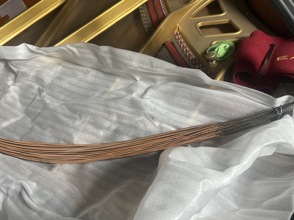 こちらは低音巻線を外して、注文のために束ねているところです。新しい弦を同じように巻線職人さんに巻いてもらいます。