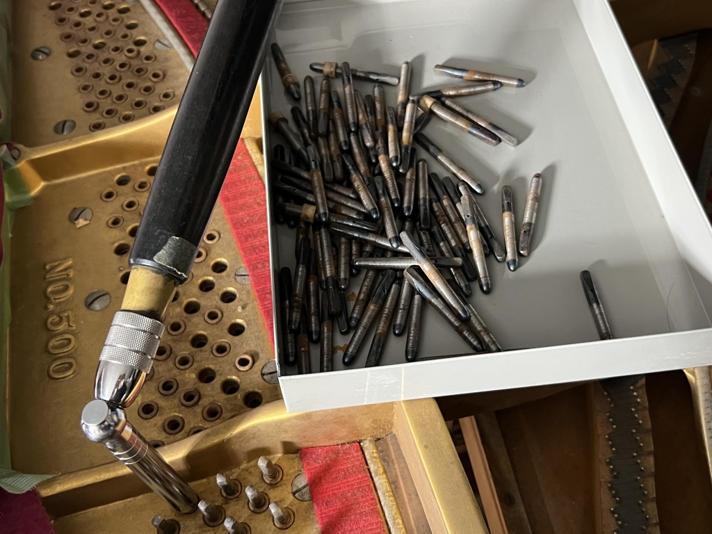 約230本ほどあるため、普通は電動ドリルで抜くことが多いかもしれませんが、そのむかし上司に、電動だと熱でピン板に負担が掛かるため、ドリルは使うなと教わったこともあり、手作業で抜いています。電動でもそれなりに時間は掛かりますが、手作業だと倍以上掛かりますがピアノのためです。